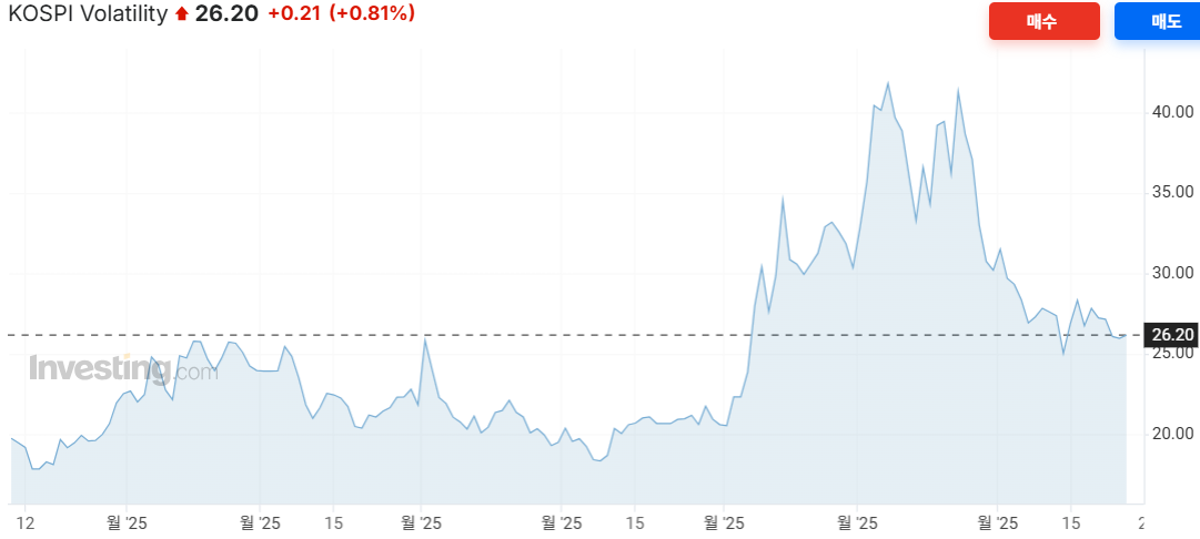 코스피 변동성 지수는 26입니다. 하락했습니다.