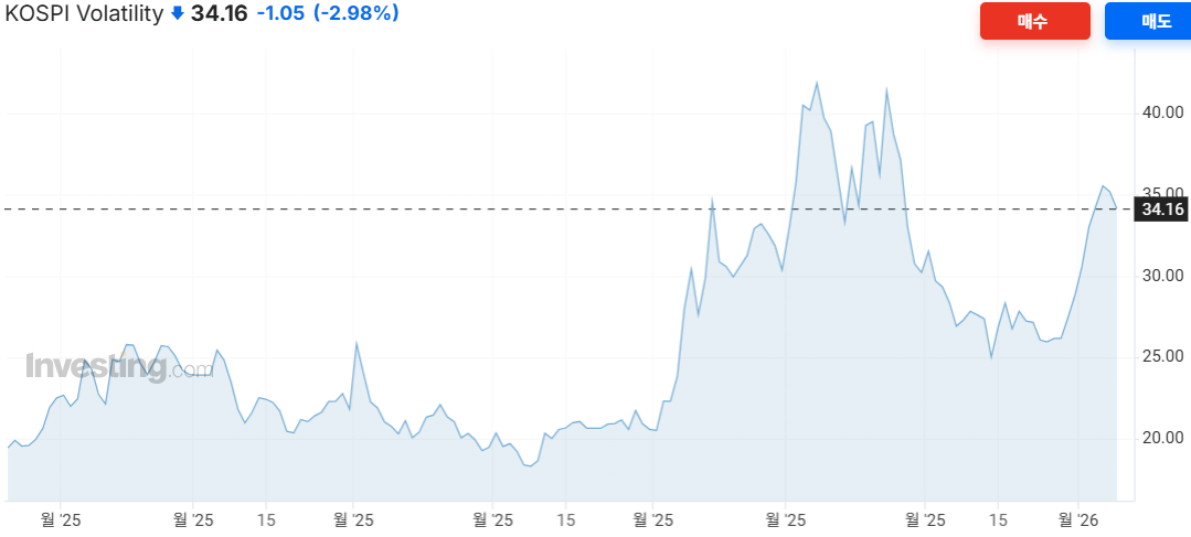 코스피 변동성 지수는 34입니다. 상승했습니다.