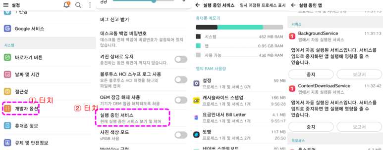 순서는 1) 개발자 옵션 활성화 2) 실행 중인 서비스 확인입니다.